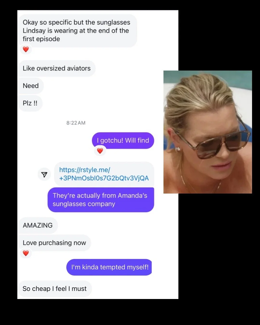 Lindsay Hubbard’s aviator sunglasses Feb 15 Written By Wear What Happens Live . Requested by a follower. Turns out these are actually from Otra, the brand that Amanda does creative direction for. Shop Lindsay's oversized aviators Lindsay HubbardSummer HouseOtra EyewearSunglassesAviators Wear What Happens Live .